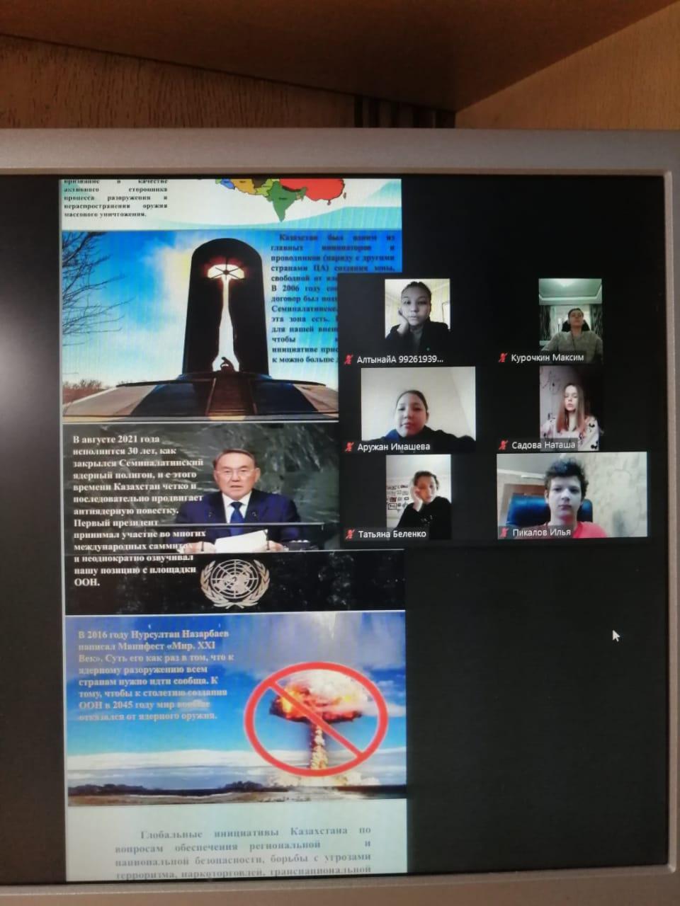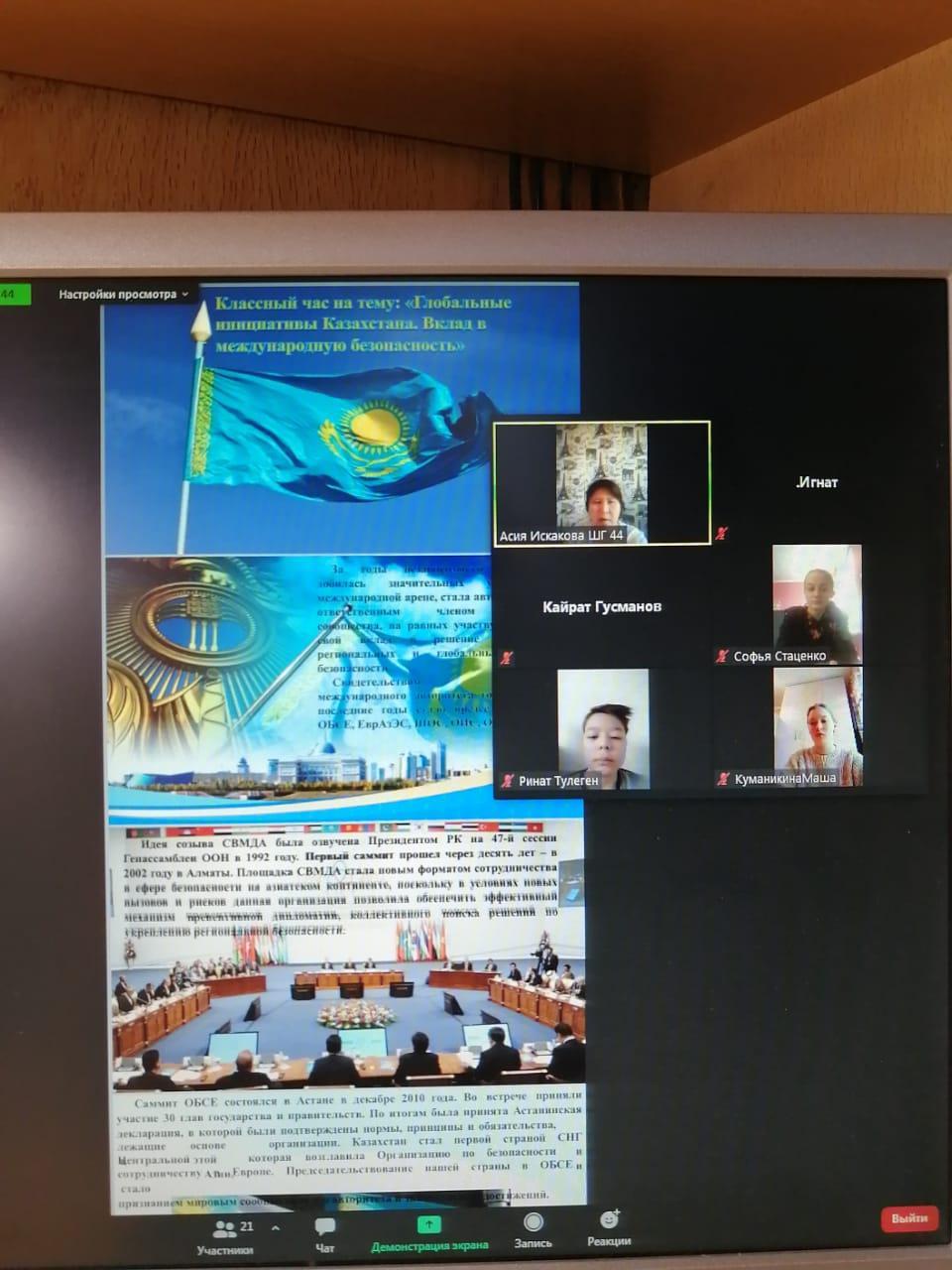 Классный час был посвящён глобальным инициативам Казахстана и вкладу в международную безопасность; формированию у учащихся казахстанского патриотизма, миролюбия, национального согласия, активной гражданской позиции, гордости и любви к Родине, осознания причастности к судьбе своей страны.