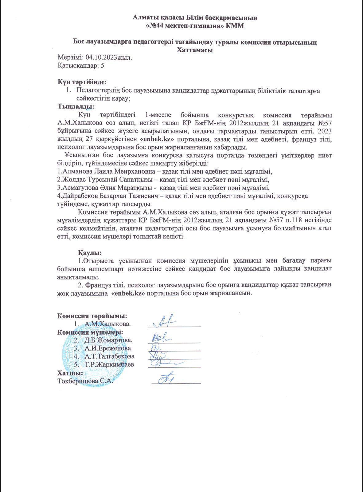 Школа-гимназия 44 » Ақпарат » Бос лауазымдарға педагогтерді тағайындау туралы комиссия отырысының Хаттамасы/Заседание конкурсной комиссии по рассмотрению документов на вакантное место