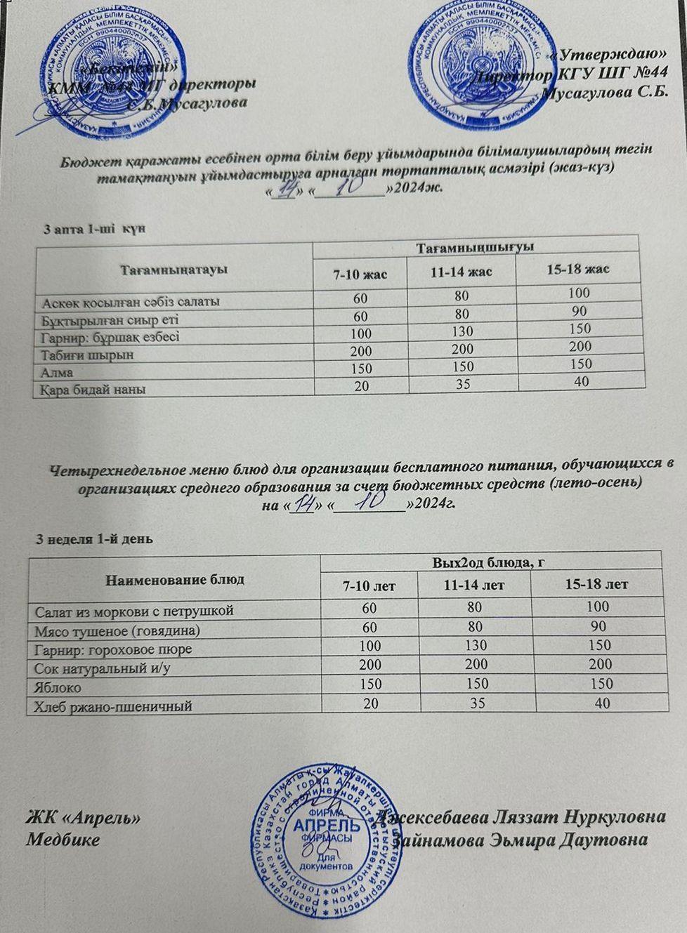Четырехнедельное меню блюд для организации бесплатного питания обучающихся в организациях среднего образования за счет бюджетных средств лето-осень 2024г