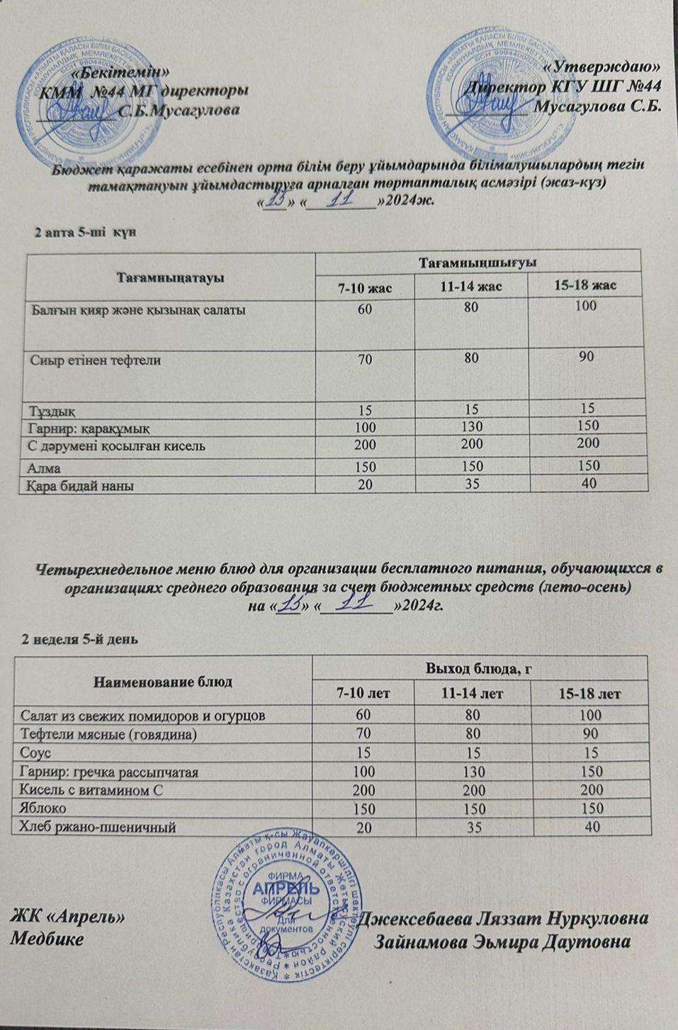 » » Четырехнедельное меню блюд для организации бесплатного питания обучающихся в организациях среднего образования за счет бюджетных средств лето-осень 2024г