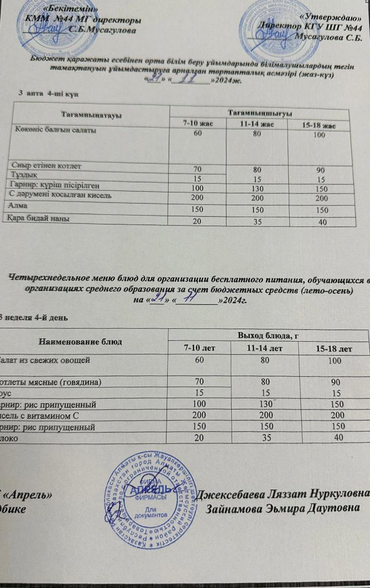 Четырехнедельное меню блюд для организации бесплатного питания обучающихся в организациях среднего образования за счет бюджетных средств лето-осень 2024г