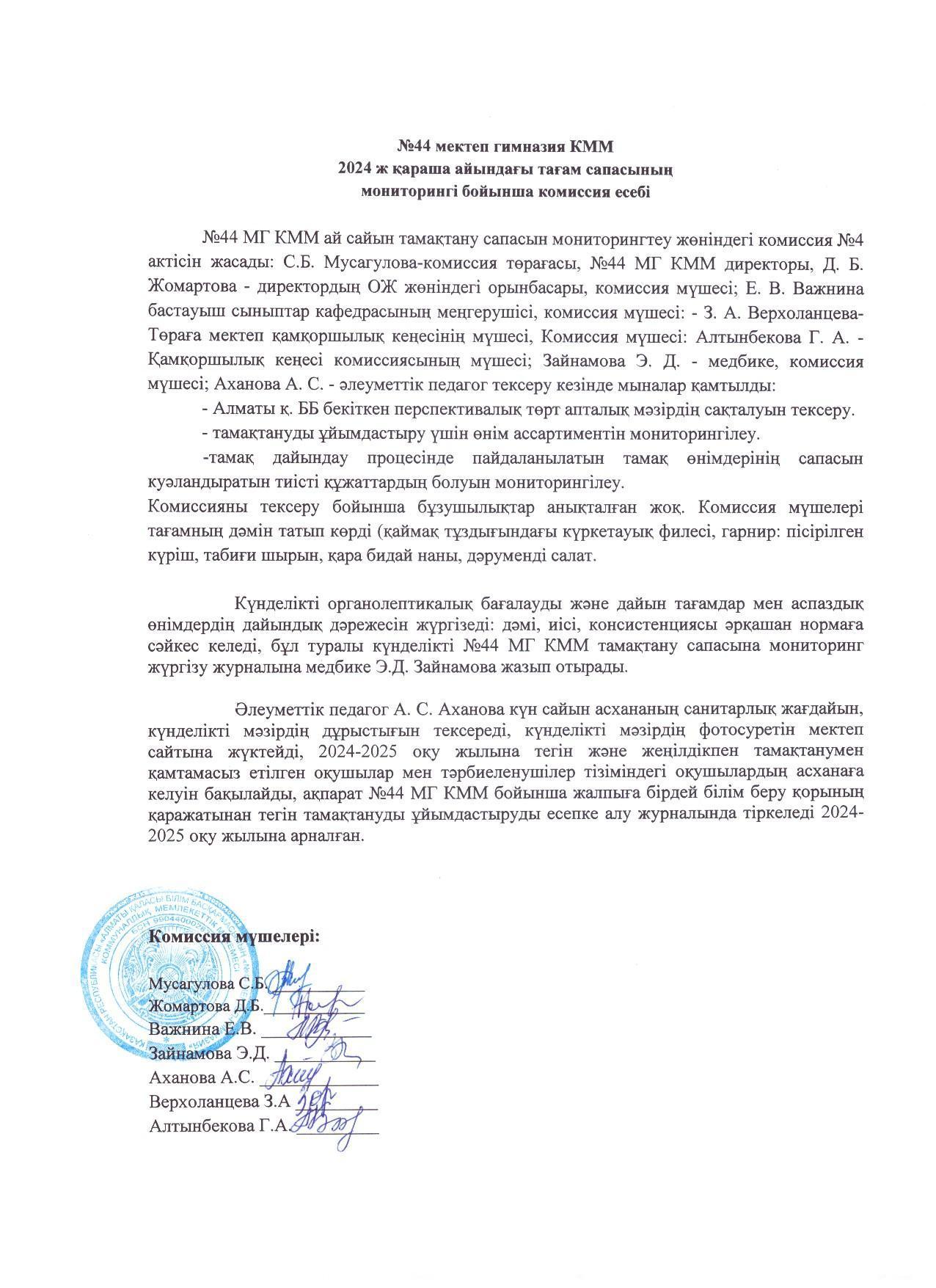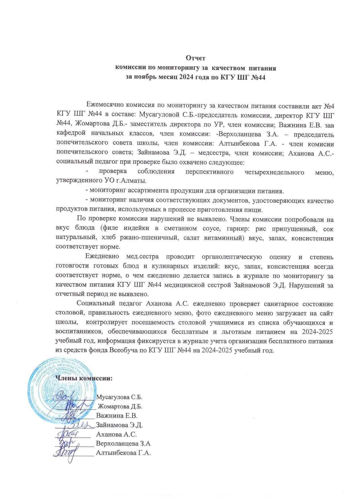 Қараша айындағы тамақтану сапасын мониторингілеу бойынша комиссия есебі 2024ж/Отчёт комиссии по мониторингу качества питания за ноябрь 2024г.