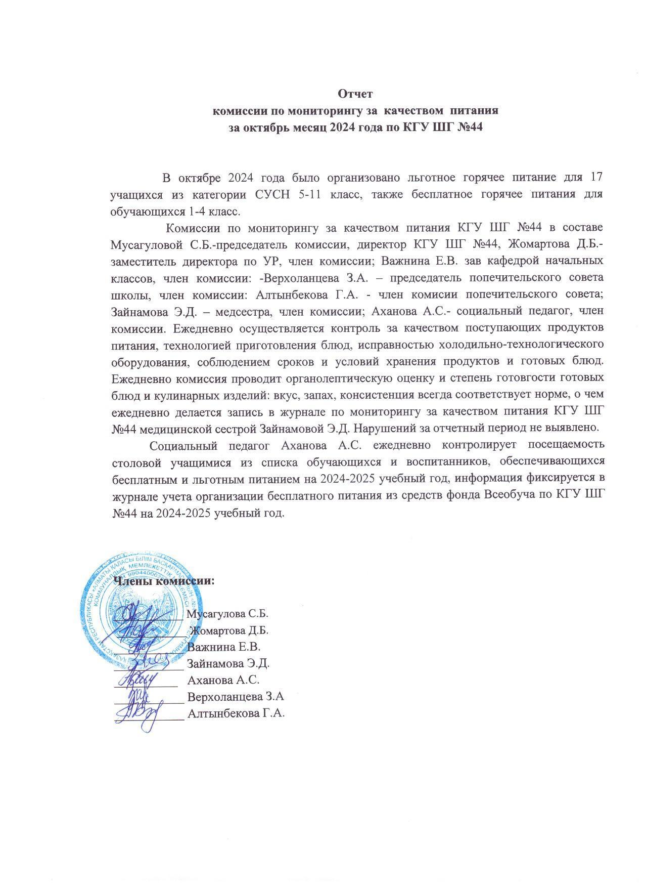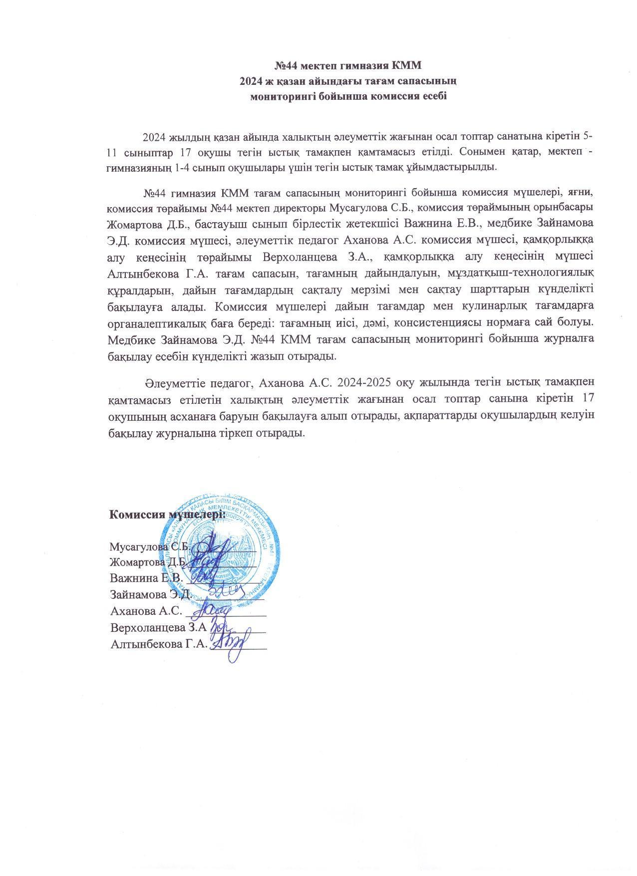 Қазан айындағы тамақтану сапасын мониторингілеу бойынша комиссия есебі 2024ж/Отчёт комиссии по мониторингу качества питания за октябрь 2024г.