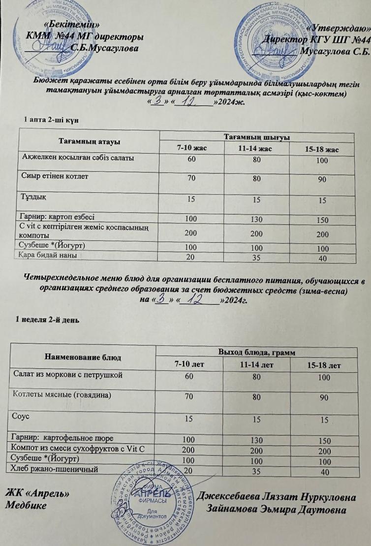 Четырехнедельное меню блюд для организации бесплатного питания обучающихся в организациях среднего образования за счет бюджетных средств зима-весна 2024г