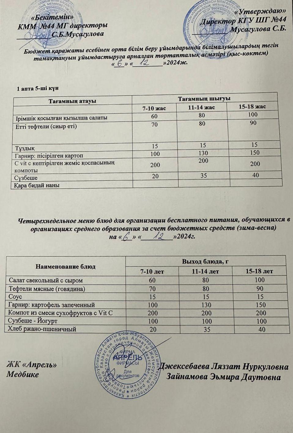 » » Четырехнедельное меню блюд для организации бесплатного питания обучающихся в организациях среднего образования за счет бюджетных средств зима-весна 2024г