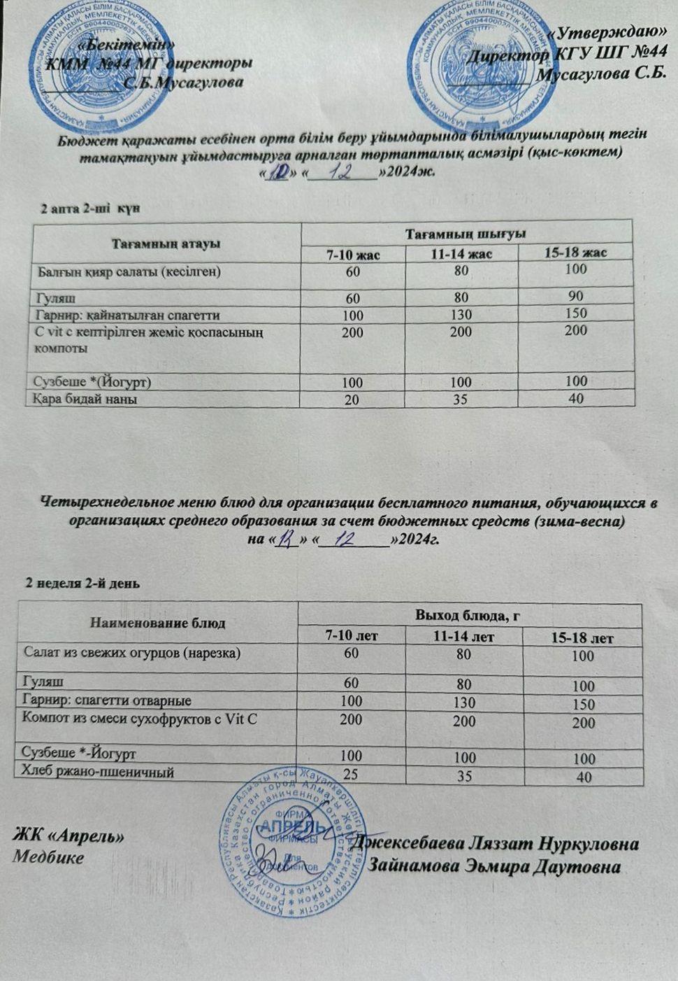 » » Четырехнедельное меню блюд для организации бесплатного питания обучающихся в организациях среднего образования за счет бюджетных средств зима-весна 2024г