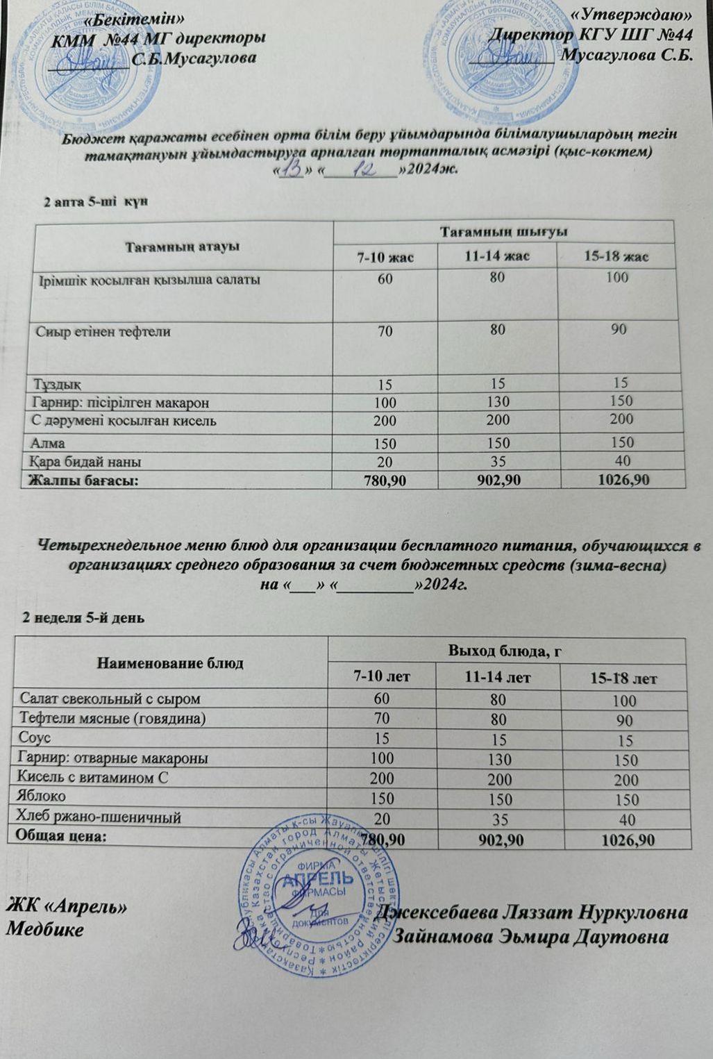 » » Четырехнедельное меню блюд для организации бесплатного питания обучающихся в организациях среднего образования за счет бюджетных средств зима-весна 2024г