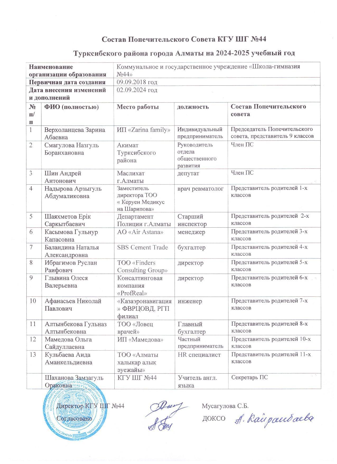 №44 МГ Қамқоршылық кеңесінің құрамы 2024-2025 оқу жылы / Состав попечительского совета КГУ ШГ №44 на 2024-2025 уч.год
