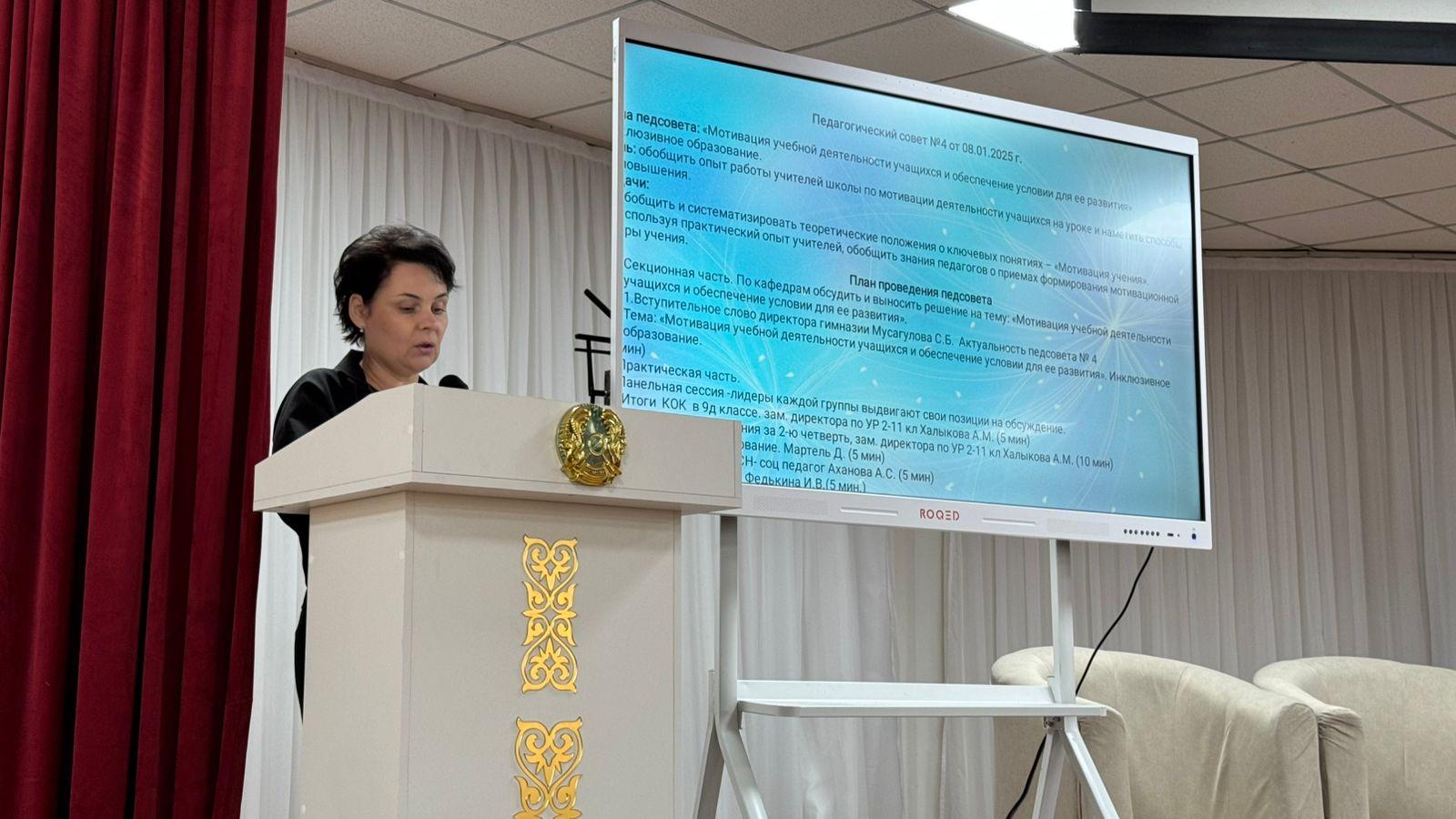 2024 жылдың 08 қаңтарында мектепте инклюзивті білім беруге баса назар аудара отырып, "оқушылардың оқу іс-әрекетін ынталандыру және оның дамуына жағдай жасау" тақырыбына арналған педагогикалық кеңес өтті. Іс-шара барысында оқушылардың оқу процесіне деген ынтасын жақсартуға бағытталған көптеген теориялық және практикалық аспектілер жинақталды. Педагогикалық кеңестің мақсаты мұғалімдердің "оқу мотивациясы" негізгі ұғымдары бойынша білімдерін жүйелеу және оқушылардың, әсіресе инклюзивті ортада мотивациясын қолдаудың жаңа тәсілдерін әзірлеу болды. Сондай-ақ, мұғалімдердің практикалық тәжірибесіне, олардың оқушылардың мотивациялық саласын қалыптастыру әдістеріне назар аударылды, бұл мектеп жұмысының жалпы көрінісін едәуір байытты. Педагогикалық кеңес екі бөлімнен тұрды. Бірінші секциялық бөлімде қатысушылар оқу қызметін ынталандыру мәселелерін және оны арттыру үшін жағдай жасау тәсілдерін талқылады. Әрбір мұғалім өз тәжірибелерімен бөлісуге, сабақтар өткізу үшін қиындықтарды және ағымдағы мәселелерді шешу жолдарын талқылауға мүмкіндік алды