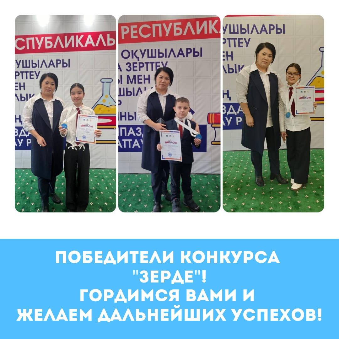 Поздравляем наших замечательных учеников с победой в конкурсе "Зерде"! Крюков Герман занял 2 место, а Даутова Ясмина и Адылхан Нұрай стали обладателями 3 места. Эти ребята показали отличные результаты и продемонстрировали высокий уровень знаний и творческих способностей. Гордимся вами и желаем дальнейших успехов!