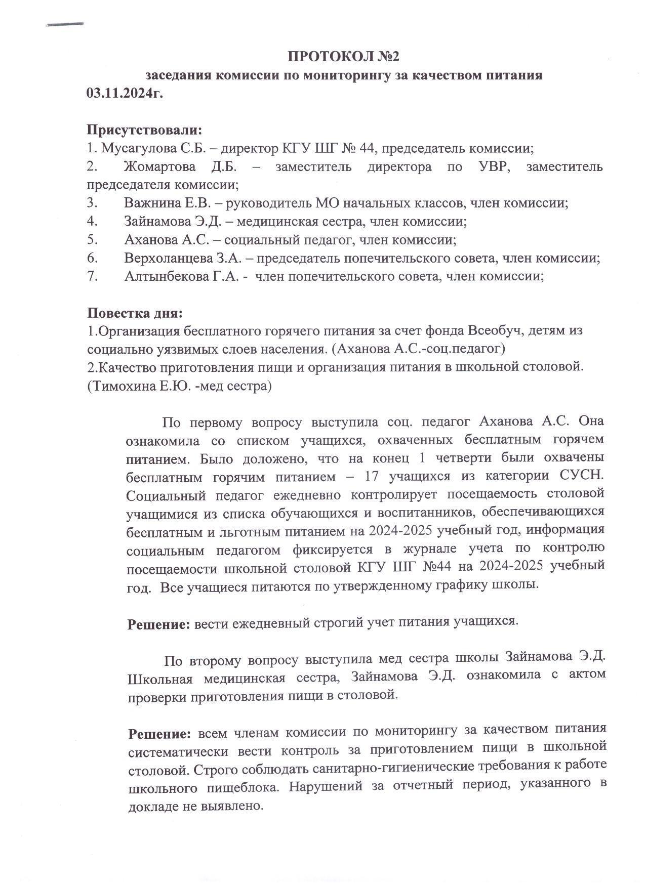 Школа-гимназия 44 » Ақпарат » Тамақтану сапасын мониторингілеу жөніндегі комиссия отырысының хаттамасы №2 /№2 Протокол заседания комиссии по мониторингу за качеством питания