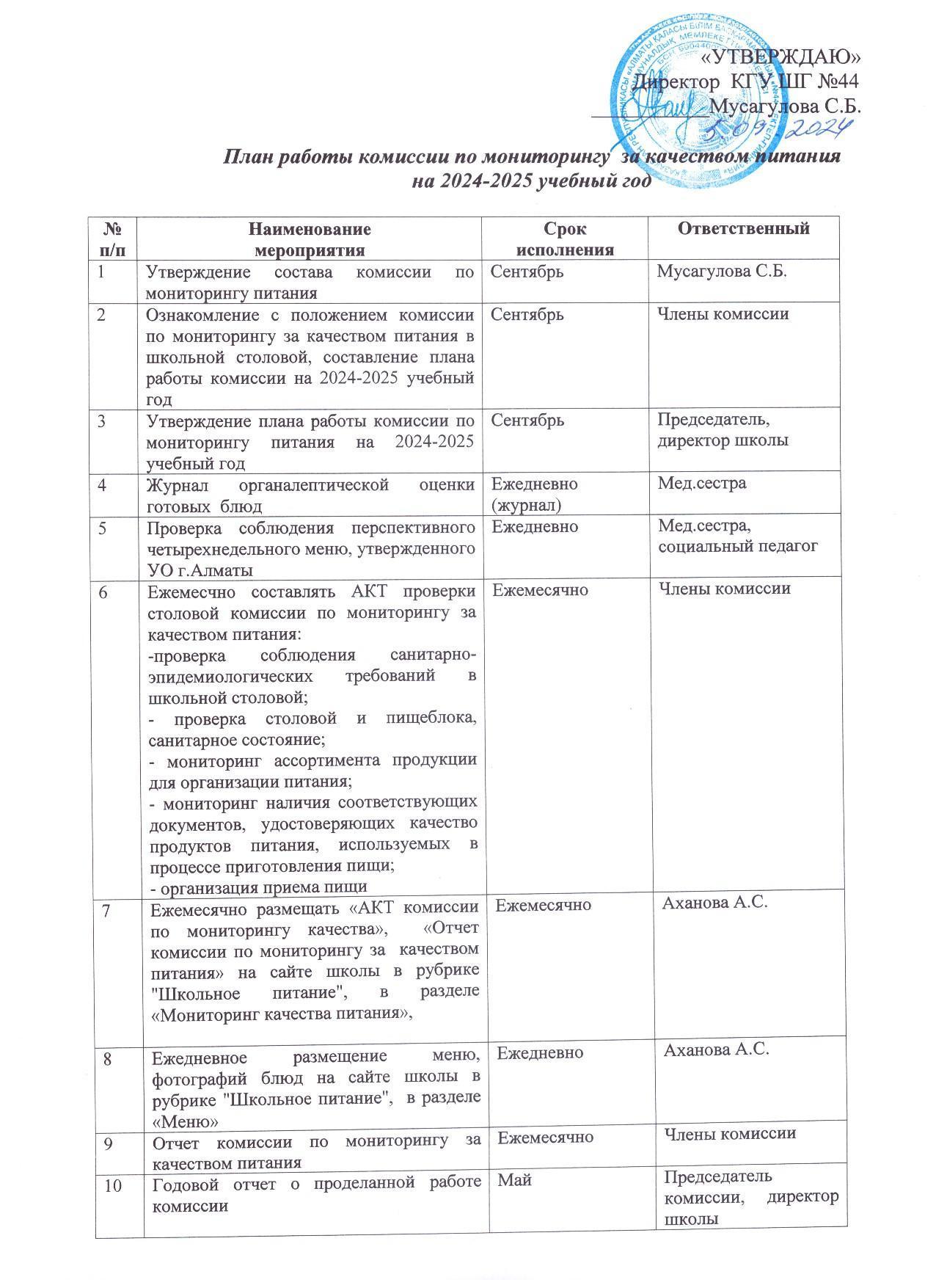 05 қыркүйек 2024 0 1 2 3 4 5 План работы комиссии по мониторингу за качеством питания на 2024-2025 уч.год