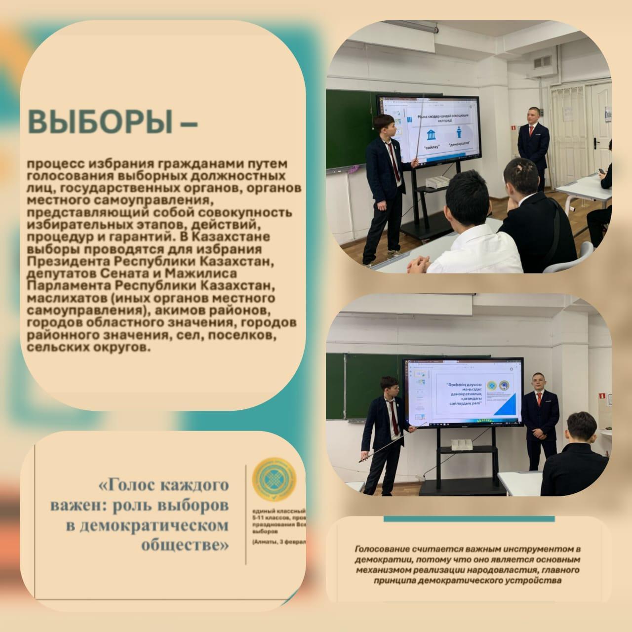 Под руководством классного руководителя Жиенкожановой Н.Н. учащиеся обсудили важность участия в выборах и значение каждого голоса для формирования демократического общества. Ребята узнали, как выборы влияют на развитие страны и почему важно осознанно подходить к своему гражданскому праву. Этот классный час стал отличной возможностью для школьников понять, как важен их голос и роль в общественной жизни.