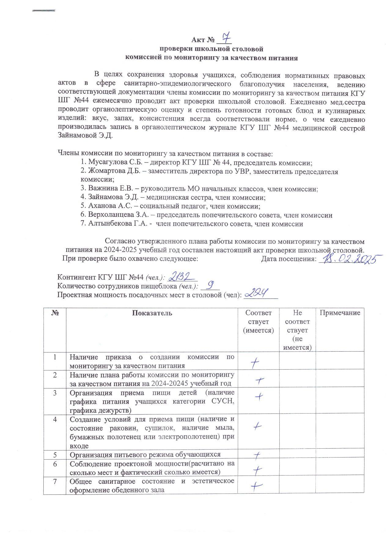 18 ақпан 2025 0 1 2 3 4 5 АКТ №7 проверки школьной столовой комиссии по мониторингу за качеством питания