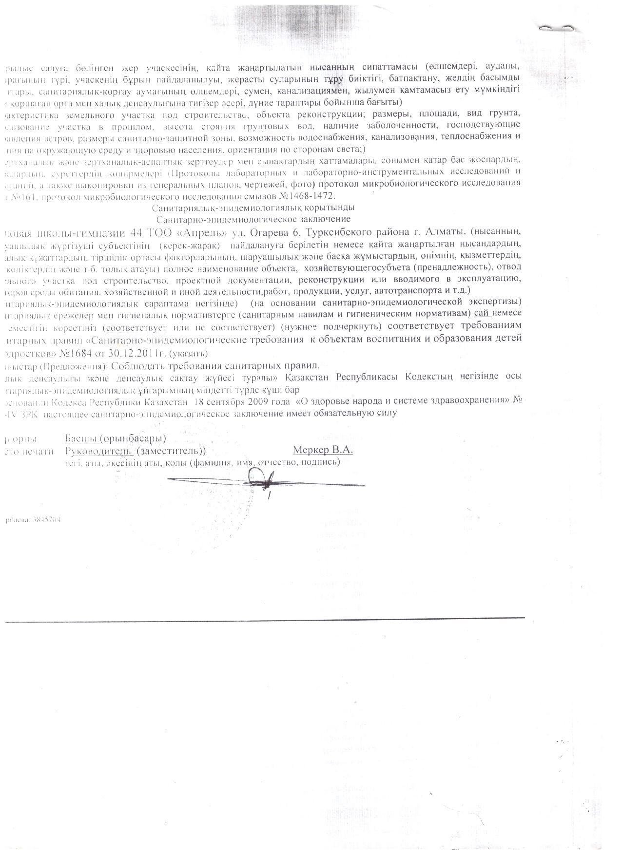 мектеп асханасына Санитариялық-эпидемиологиялық қорытынды/Санитарно-эпидемиологическое заключение столовой школы