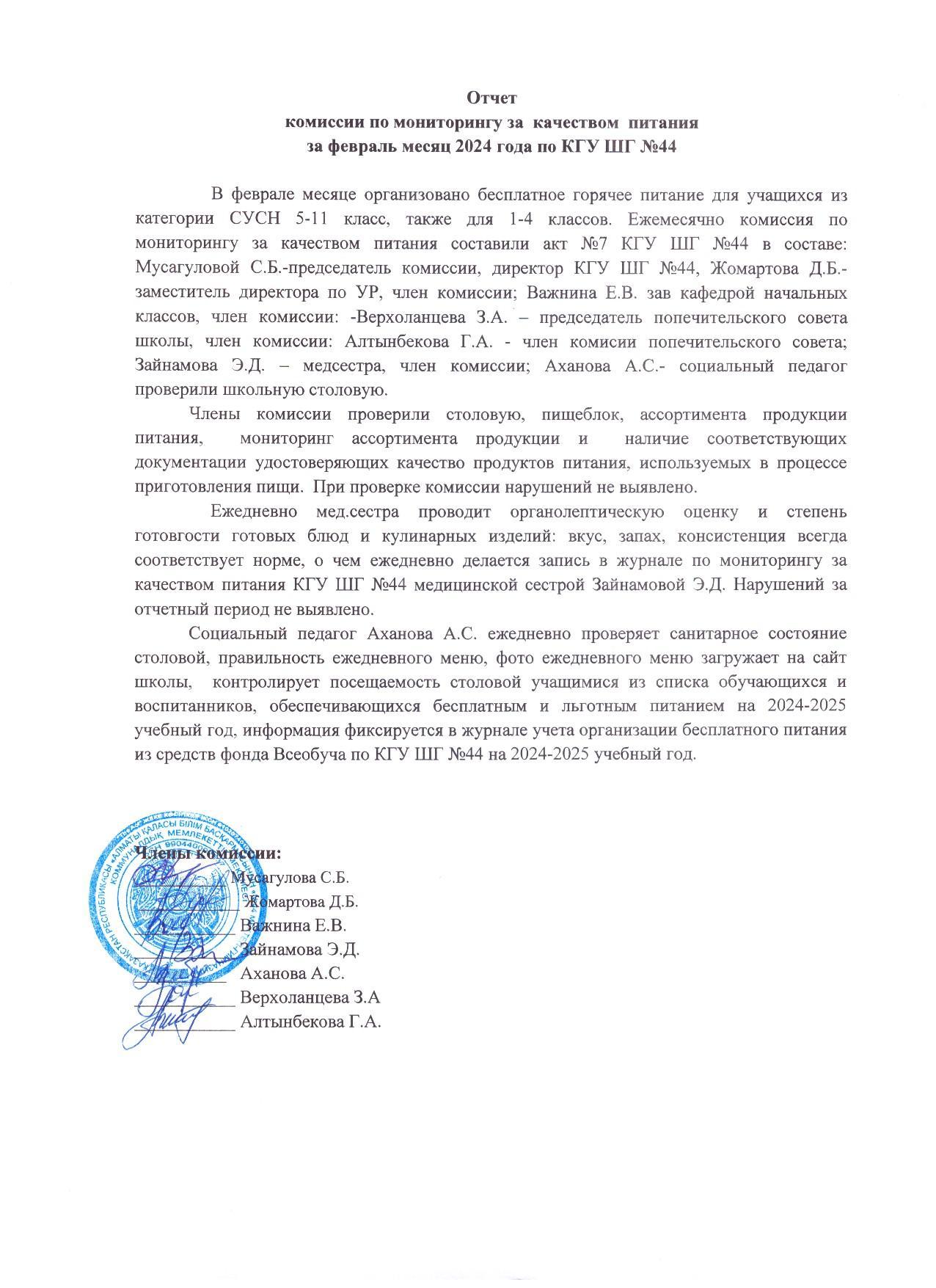 Ақпан айындағы тамақтану сапасын мониторингілеу бойынша комиссия есебі 2025ж/Отчёт комиссии по мониторингу качества питания за февраль 2025г