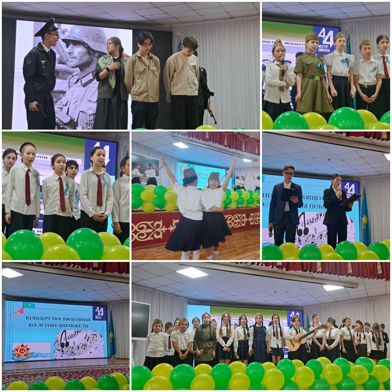 №44 мектеп-гимназиясында Жеңіс күніне арналған салтанатты концерт өтті. Шара Ұлы Жеңістің 80 жылдығына арналды. Концертке оқушылардың ата-аналары шақырылып, патриоттық және әскери әндер орындалды. Әндер арқылы оқушылар Отанға деген сүйіспеншілігін, бейбітшілік пен ерлікке деген құрметін жеткізді. Концерт соңында 8–9 сынып оқушыларының қатысуымен «Мельпомена» театр үйірмесі қойған «Ана туралы баллада» қойылымы көрермендердің жүрегін тербеді. Іс-шараны ұйымдастырған музыка пәнінің мұғалімі Айман Мусаевнаға шын жүректен алғыс білдіреміз!