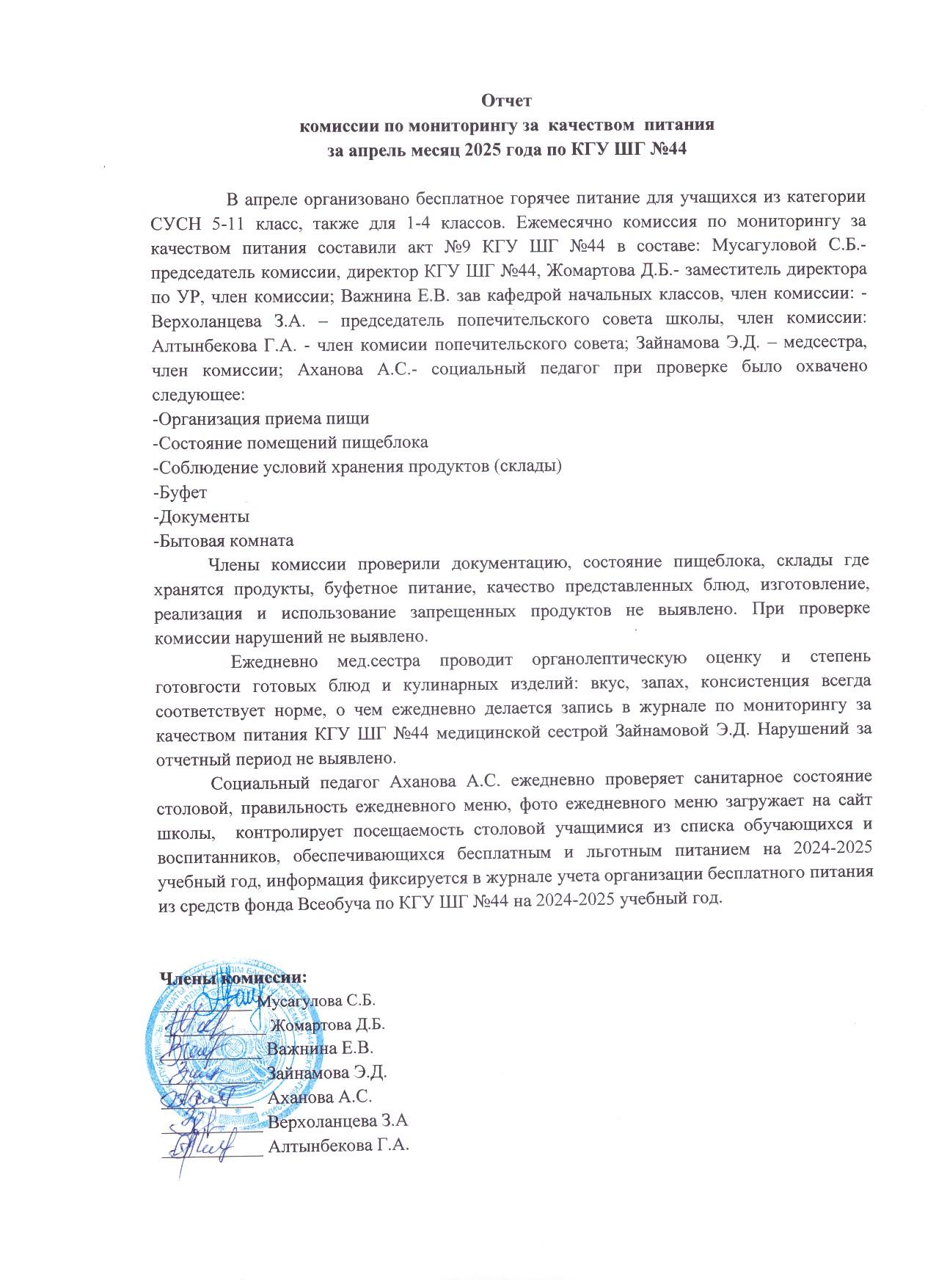 Сәуір айындағы тамақтану сапасын мониторингілеу бойынша комиссия есебі 2025ж/Отчёт комиссии по мониторингу качества питания за апрель 2025г