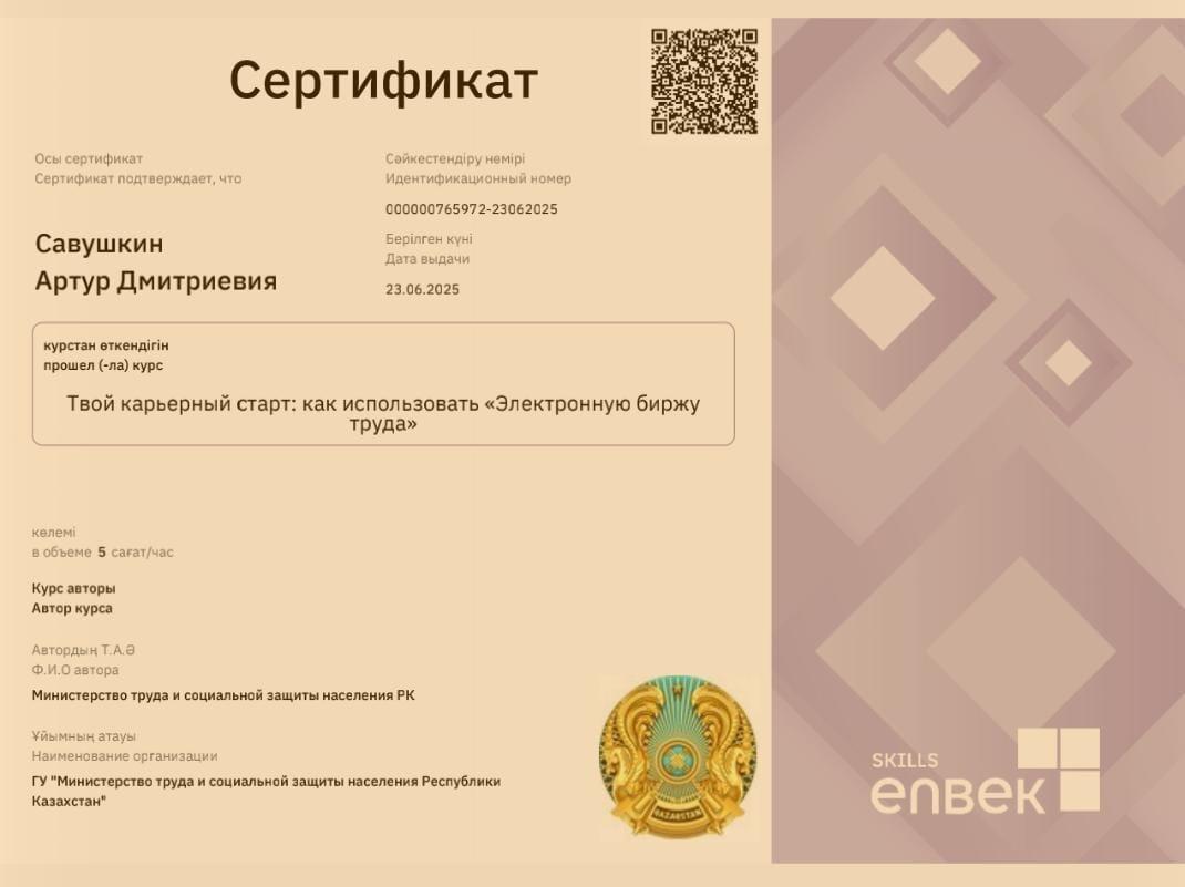 🔹 Сертификат автоматически отображается в резюме на Электронной бирже труда Enbek.kz, что повышает шансы на трудоустройство .