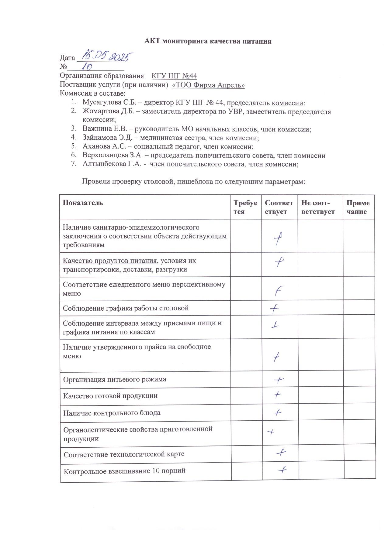 15 мамыр 2025 0 1 2 3 4 5 АКТ №10 проверки школьной столовой комиссии по мониторингу за качеством питания