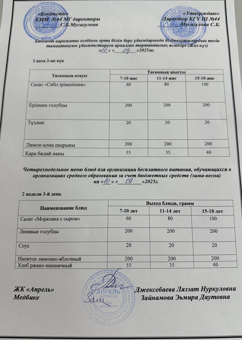 » » Четырехнедельное меню блюд для организации бесплатного питания обучающихся в организациях среднего образования за счет бюджетных средств лето-осень 2025г