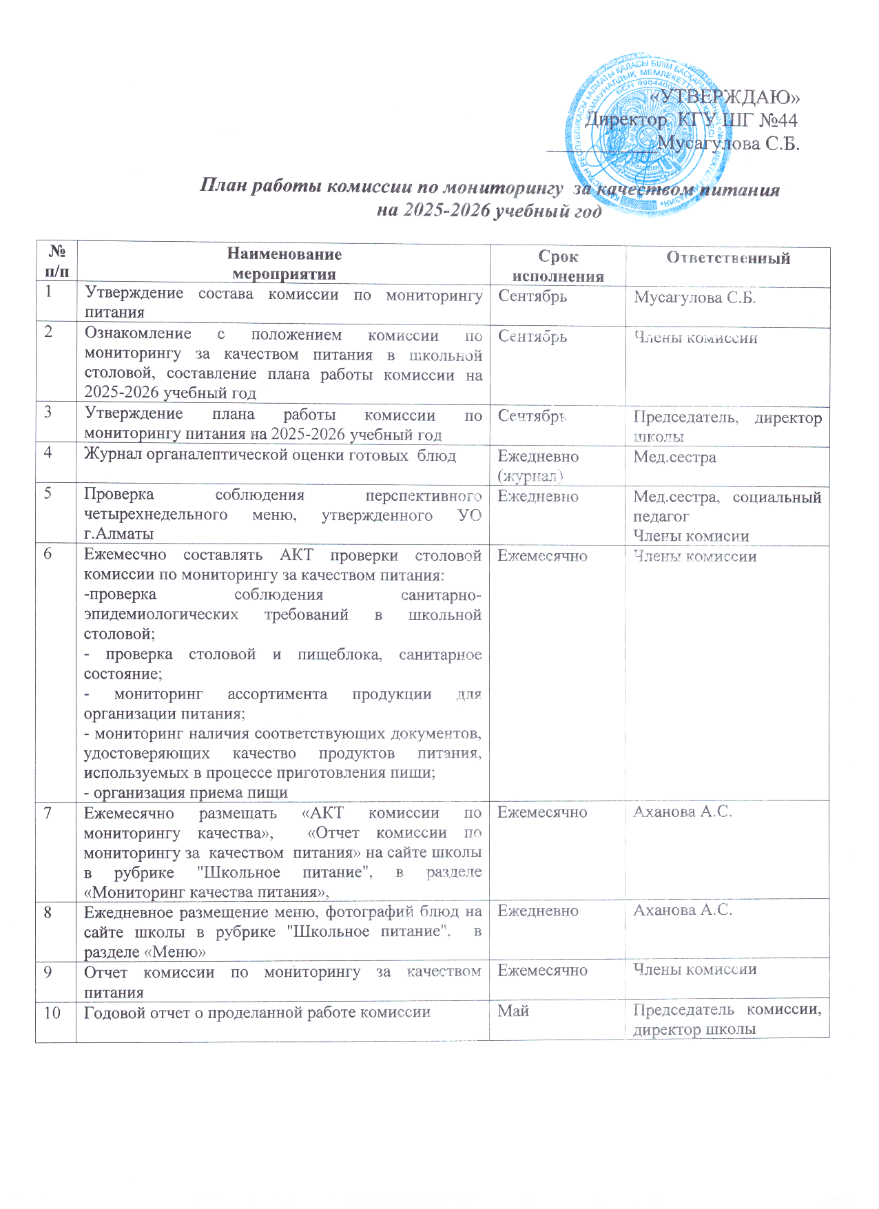 02 қыркүйек 2025 0 1 2 3 4 5 Тамақ өнімдерінің спасын бақылау жөніндегі комиссияның жұмыс жоспары 2025-2026 оқу жылы
