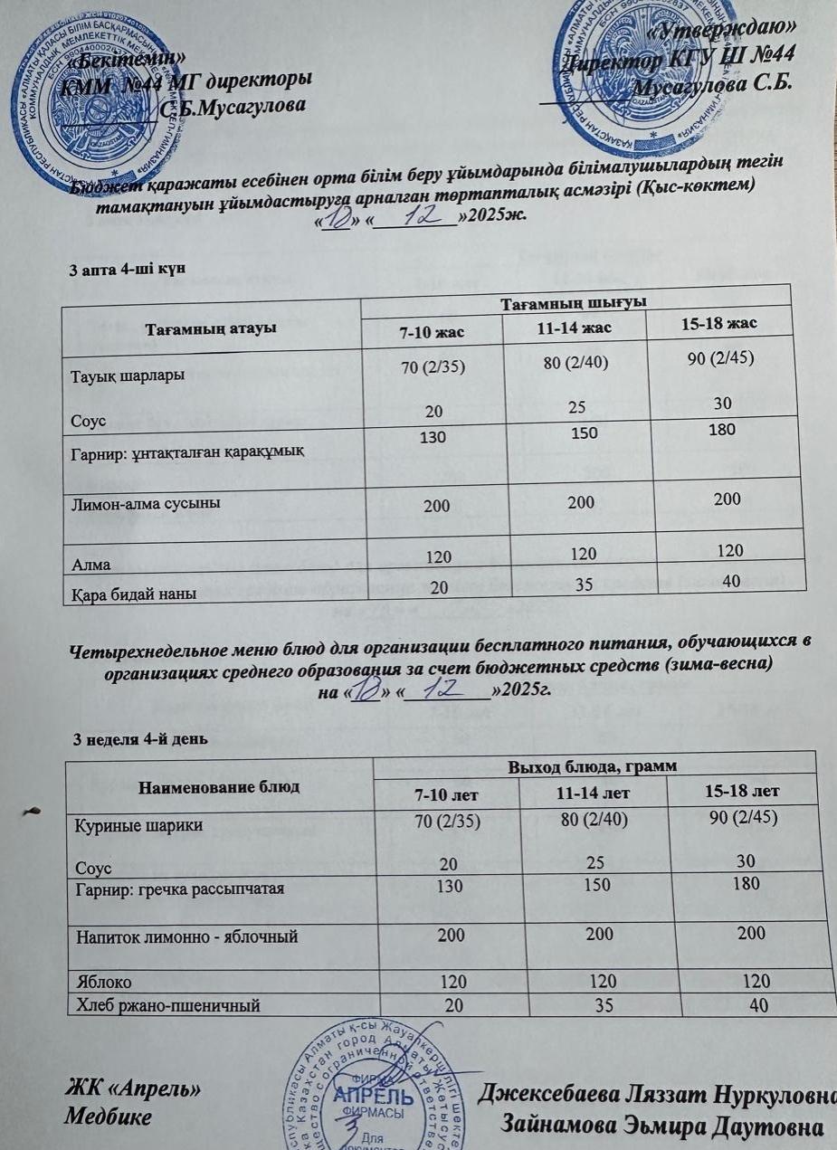 » » Четырехнедельное меню блюд для организации бесплатного питания обучающихся в организациях среднего образования за счет бюджетных средств зима-весна 2025г