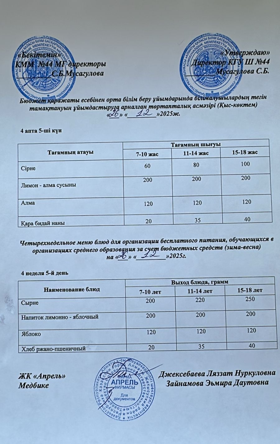 » » Четырехнедельное меню блюд для организации бесплатного питания обучающихся в организациях среднего образования за счет бюджетных средств зима-весна 2025г