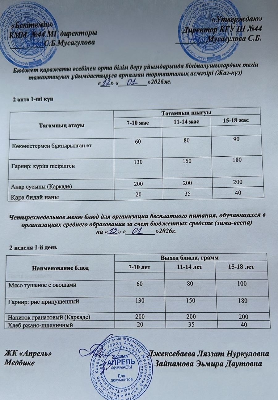 » » Четырехнедельное меню блюд для организации бесплатного питания обучающихся в организациях среднего образования за счет бюджетных средств зима-весна 2026г