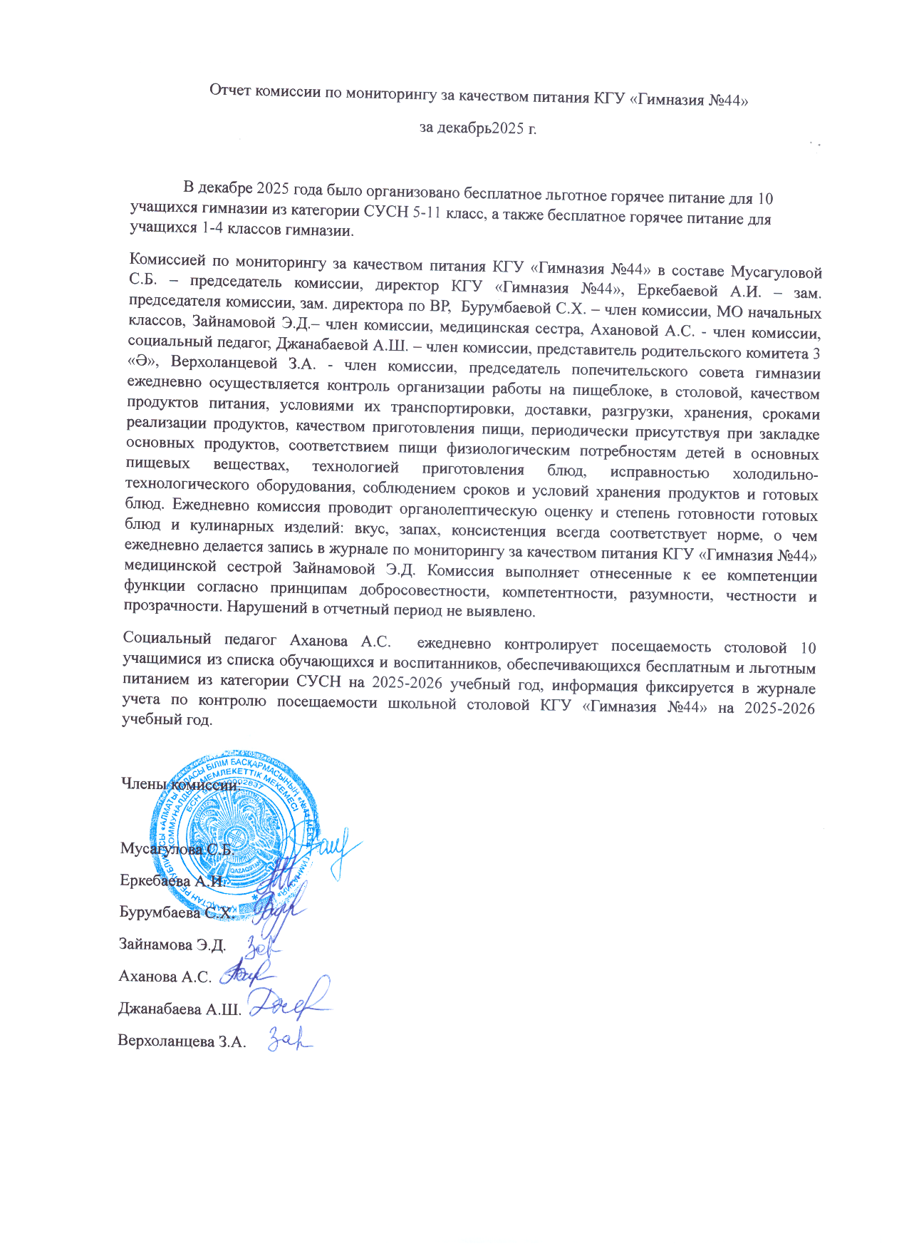 Желтоқсан айындағы тамақтану сапасын мониторингілеу бойынша комиссия есебі 2025ж/Отчёт комиссии по мониторингу качества питания за декабрь 2025г