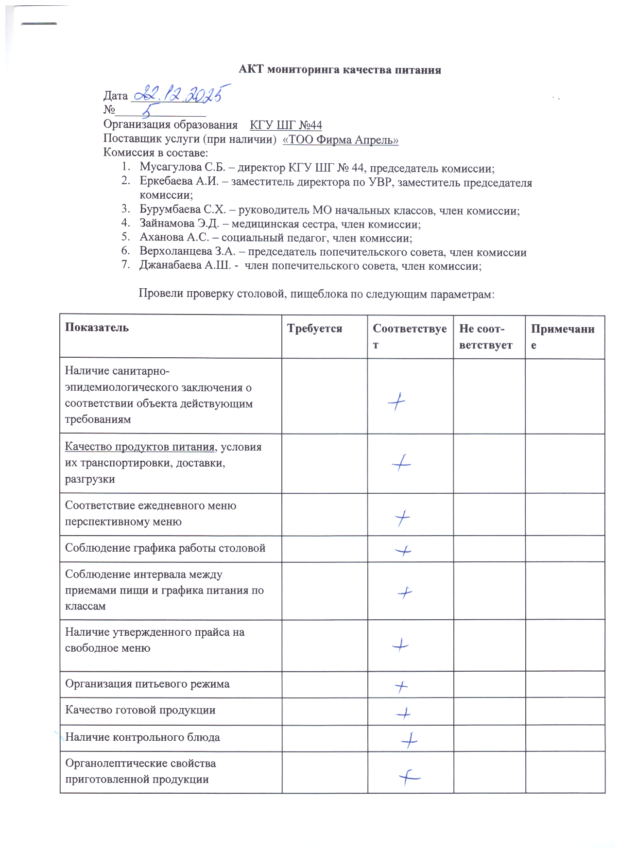 Желтоқсан айындағы тамақтану сапасын мониторингілеу бойынша комиссия есебі 2025ж/Отчёт комиссии по мониторингу качества питания за декабрь 2025г