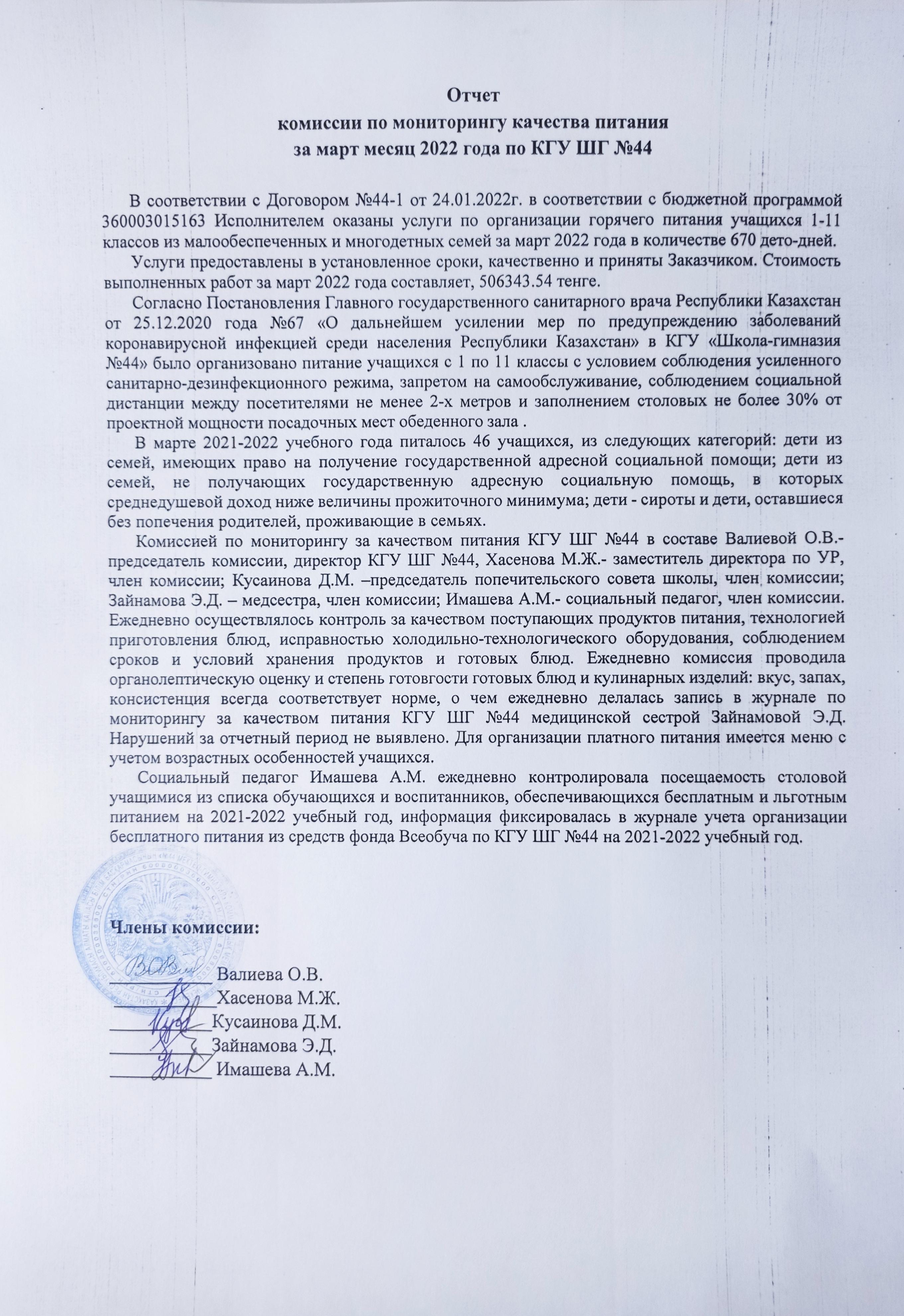 Отчет комиссии по мониторингу качества питания за февраль месяц 2022 года