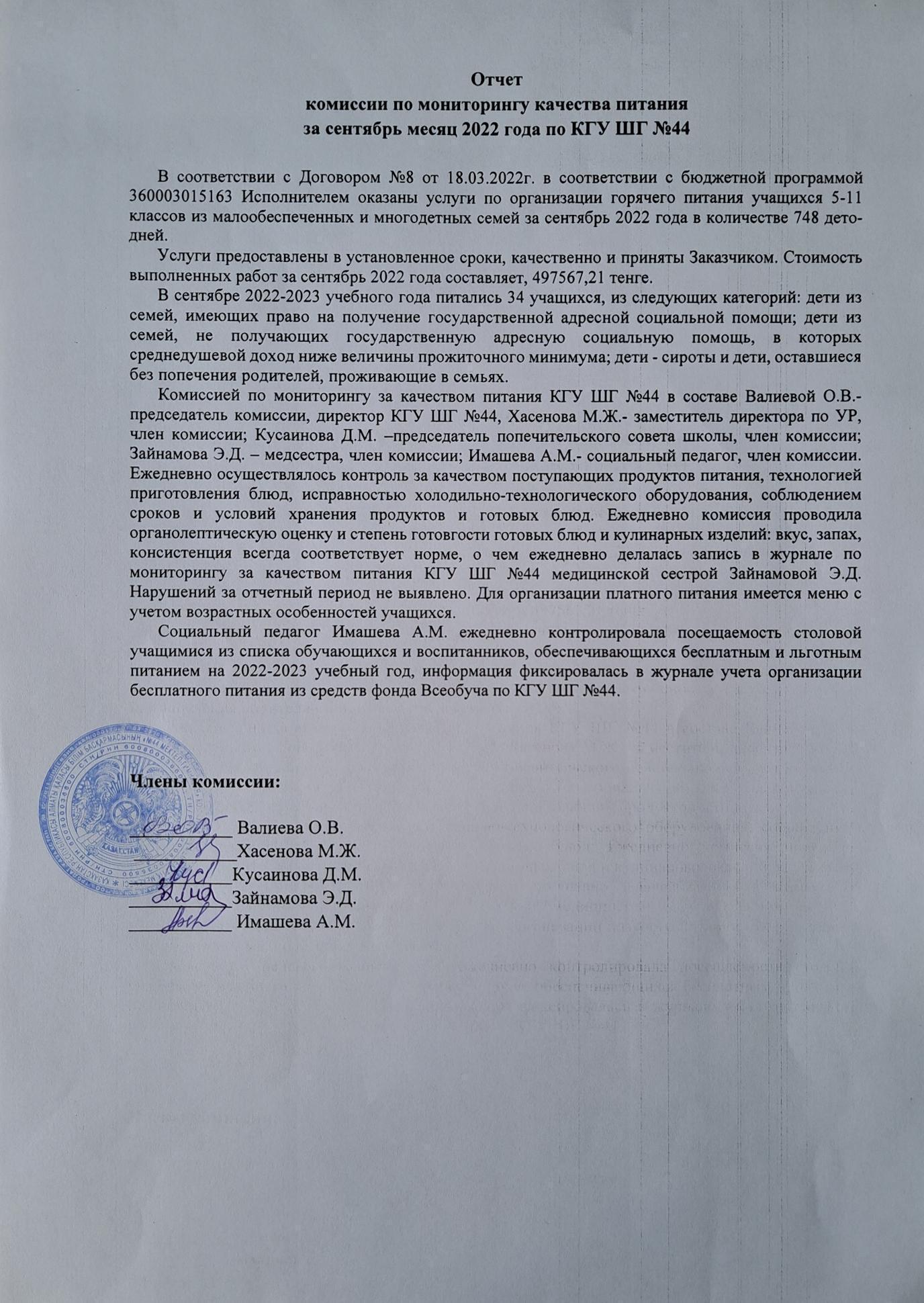 Отчет комиссии по мониторингу качества питания за сентябрь 2022г.