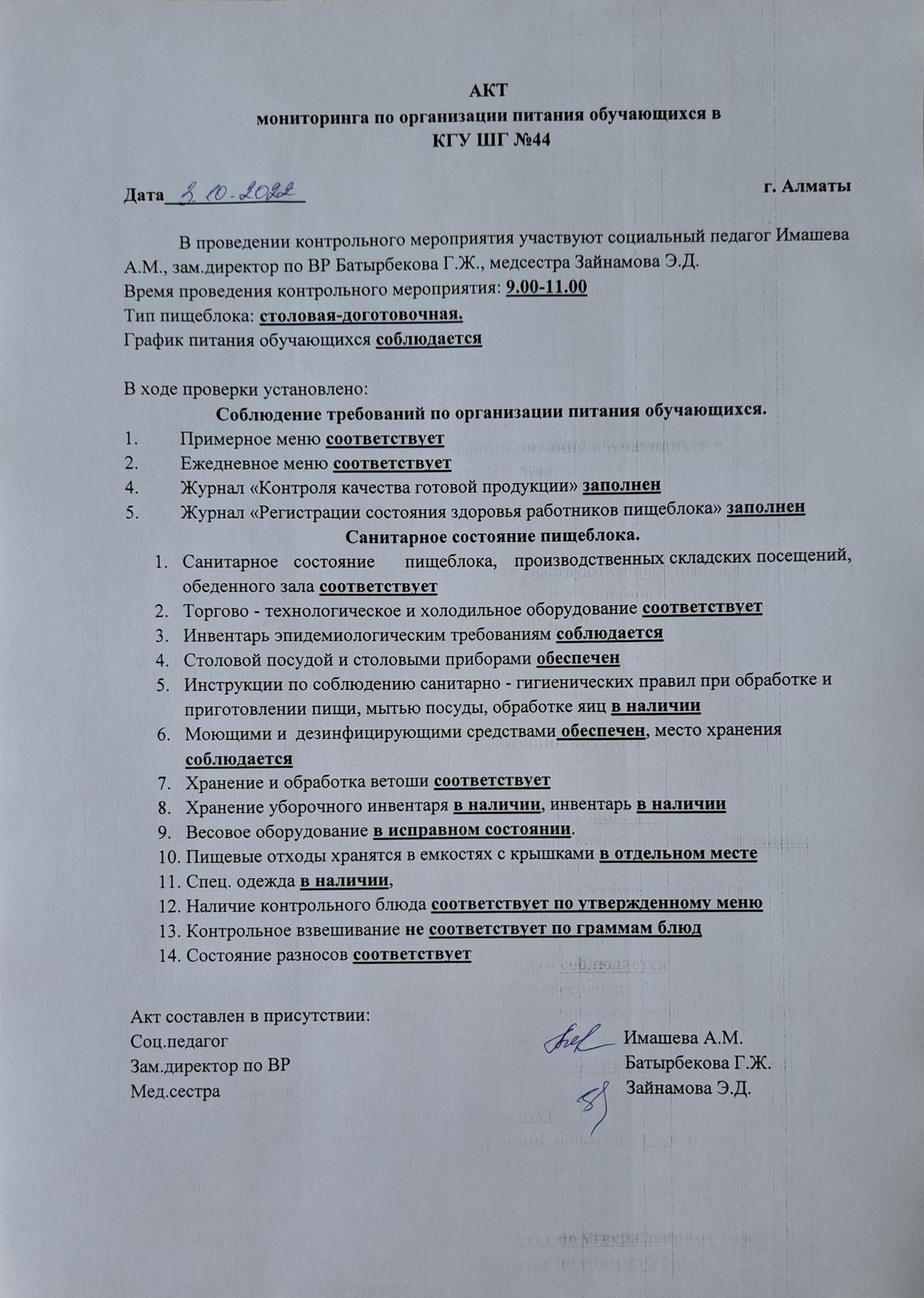 » Акт мониторинга по организации питания за 03.10.22г