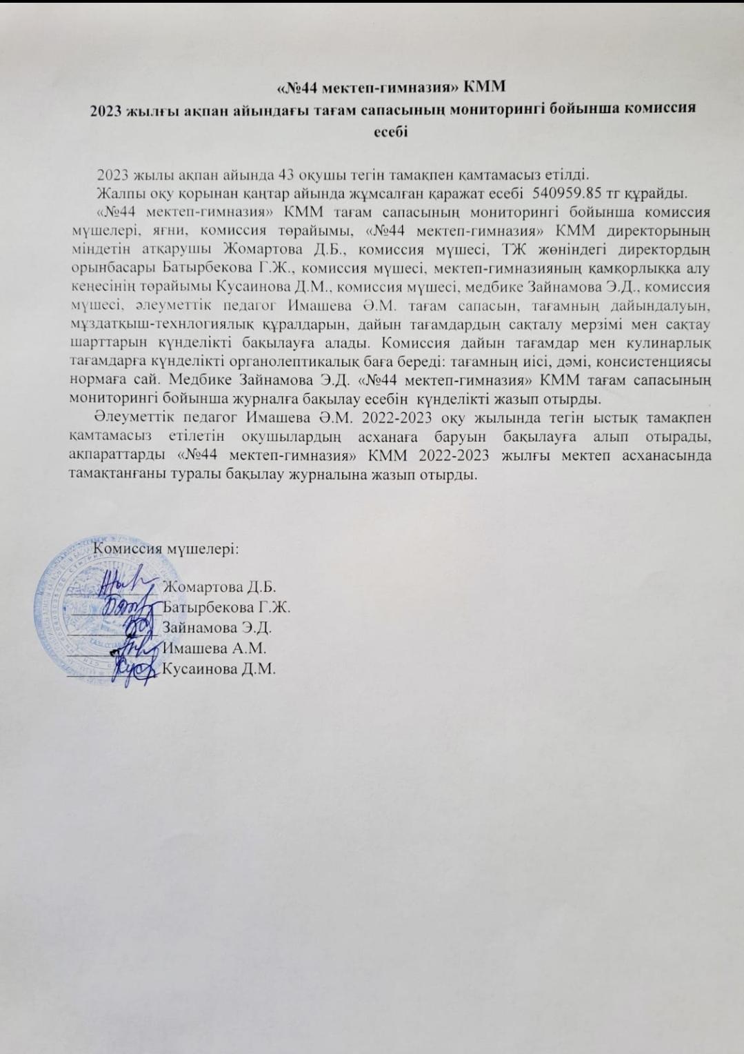 28 ақпан 2023 0 1 2 3 4 5 2023ж. ақпан айындағы тағам сапасының мониторингі бойынша комиссия есебі/Отчёт комиссии по мониторингу качества питания за февраль 2023г.