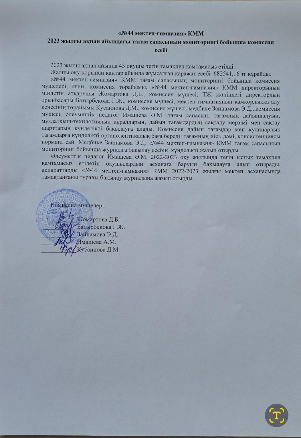 28 ақпан 2023 0 1 2 3 4 5 2023ж. ақпан айындағы тағам сапасының мониторингі бойынша комиссия есебі/Отчёт комиссии по мониторингу качества питания за февраль 2023г.