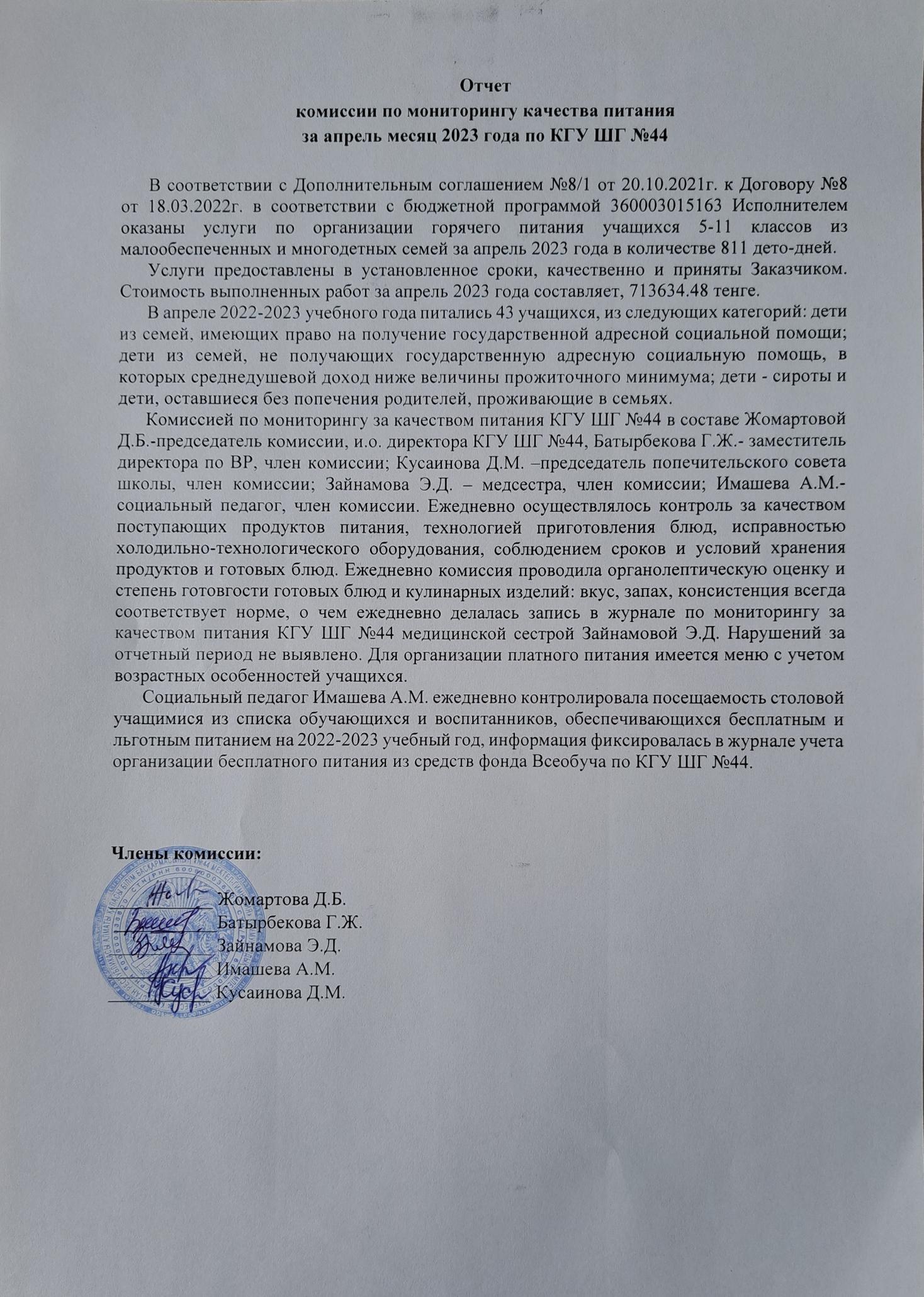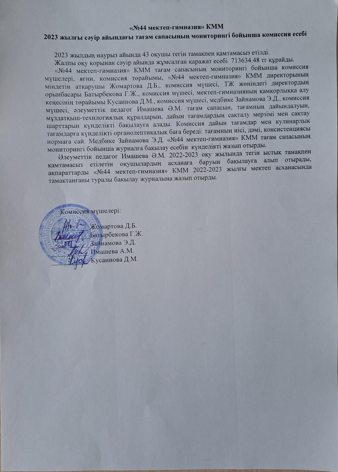 30 сәуір 2023 0 1 2 3 4 5 2023ж. сәуір айындағы тағам сапасының мониторингі бойынша комиссия есебі/ Отчёт комиссии по мониторингу качества питания за апрель 2023г.