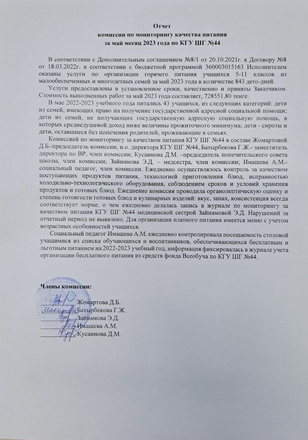 31 мамыр 2023 0 1 2 3 4 5 2023ж. мамыр айындағы тағам сапасының мониторингі бойынша комиссия есебі/Отчёт комиссии по мониторингу качества питания за май 2023г.