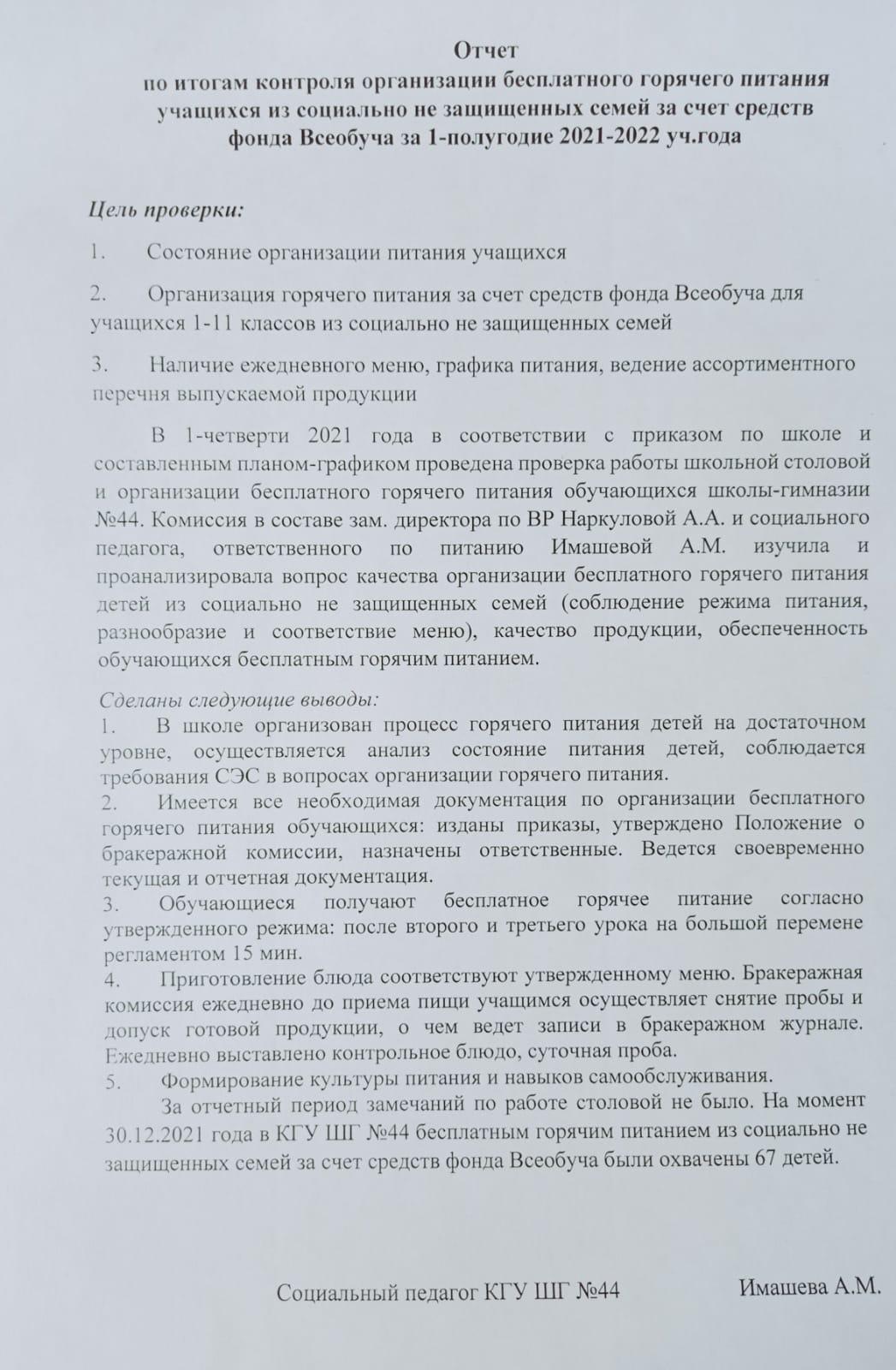 » Отчет по питанию за 1 полугодие 2021-2022 год