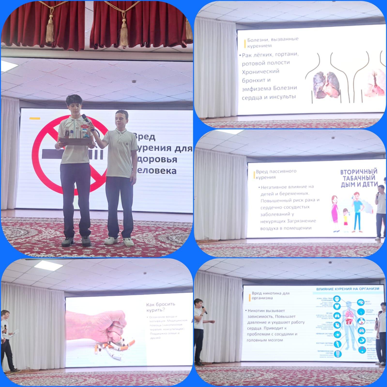 Бүгін 7 "Д" сынып оқушылары «Шылым шегудің денсаулыққа қауіптілігі неде?» тақырыбында өз жобаларын таныстырды. Оқушылар мәселені жан-жақты ашып қана қоймай, өз жұмыстарын сенімді түрде қорғап, жауапкершілікпен дайындалғандарын көрсетті.