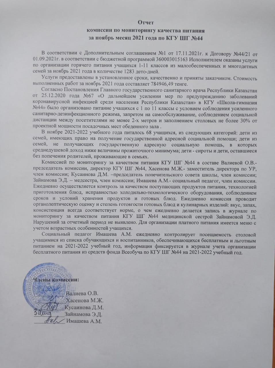 » Отчет по питанию за ноябрь 2021 год